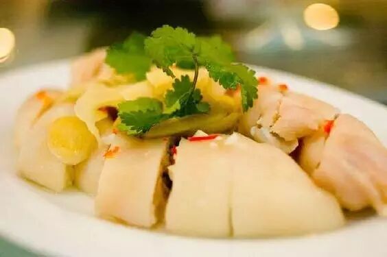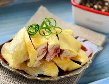它属于浸鸡类,慢火煮浸,刚熟即可。不加配料,备以姜蓉、葱丝拌盐,淋上熟油盛碟中蘸着吃。皮爽肉滑,清淡鲜美。