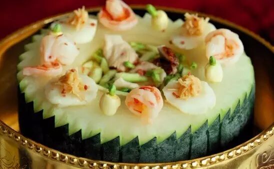 将8斤左右的冬瓜洗净,沥干水分,随后切取一端,呈茶盅状,挖去瓤子,蒂部削平,口部周围切锯齿纹,口朝上摆放。里面随自己喜好放清凉食材进行炖煮。