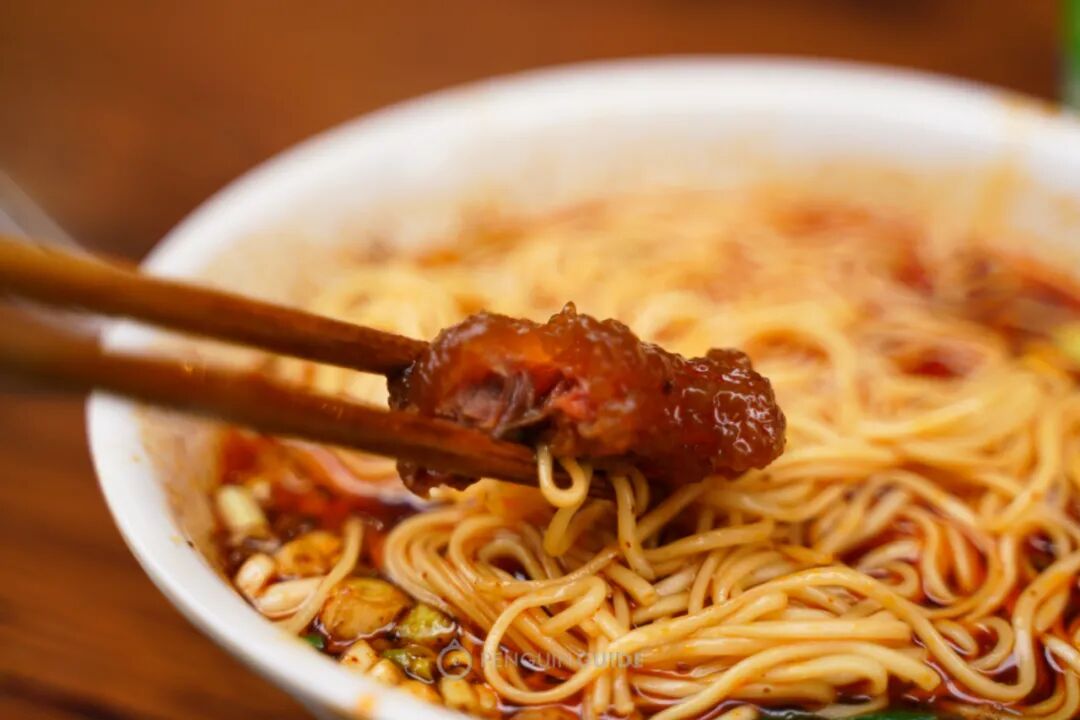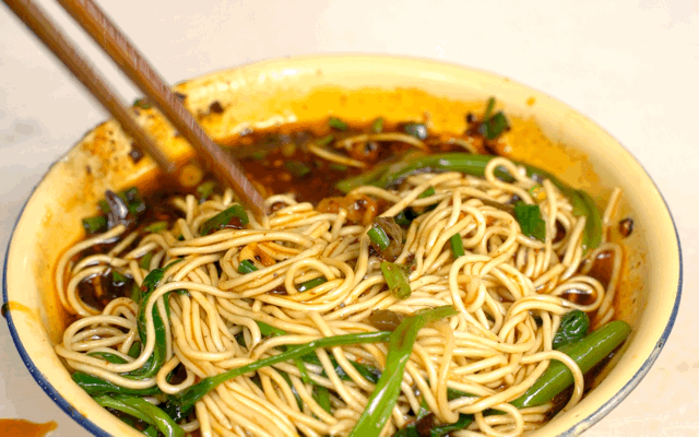 吃面,不能吸溜,一定要慢慢咀嚼。感受依附在面条上的佐料风味,麻辣咸鲜轮番上阵。