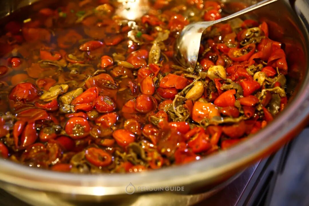 先说这糊辣派,是指煸炒中不加油,任由猛火将辣椒煸香,带来一种独特的焦香,相较于香辣,更多了一丝悠长回味。