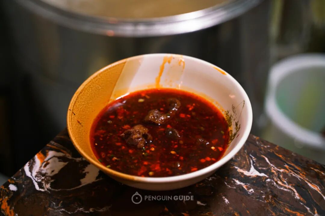新鲜肥肠经过反复搓洗,吃起来一点异味也没有。再加上香料和辣椒的炖煮,红油深深地浸润进肥肠的肌理中……