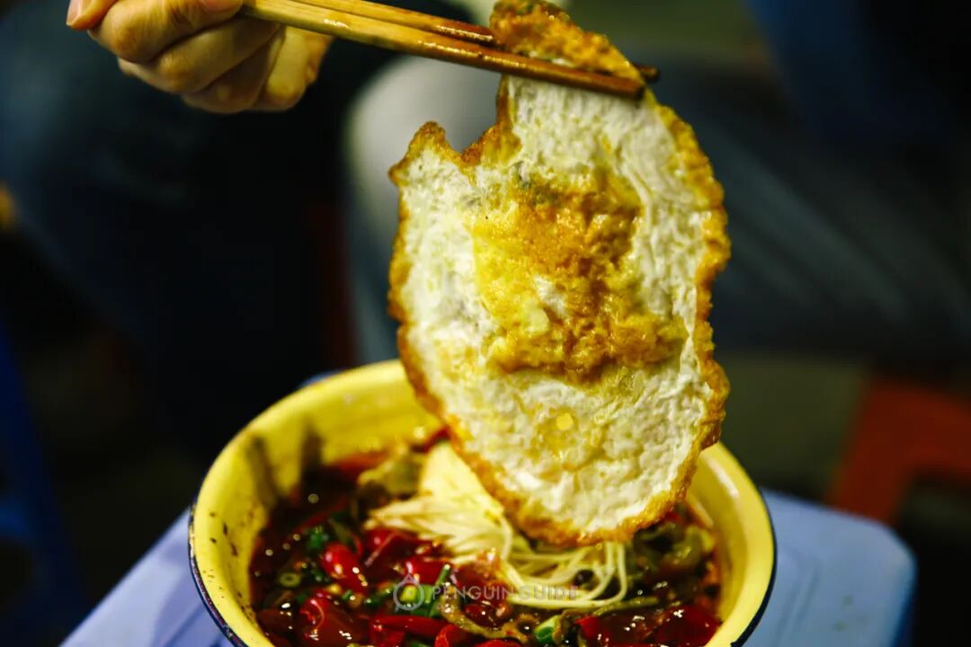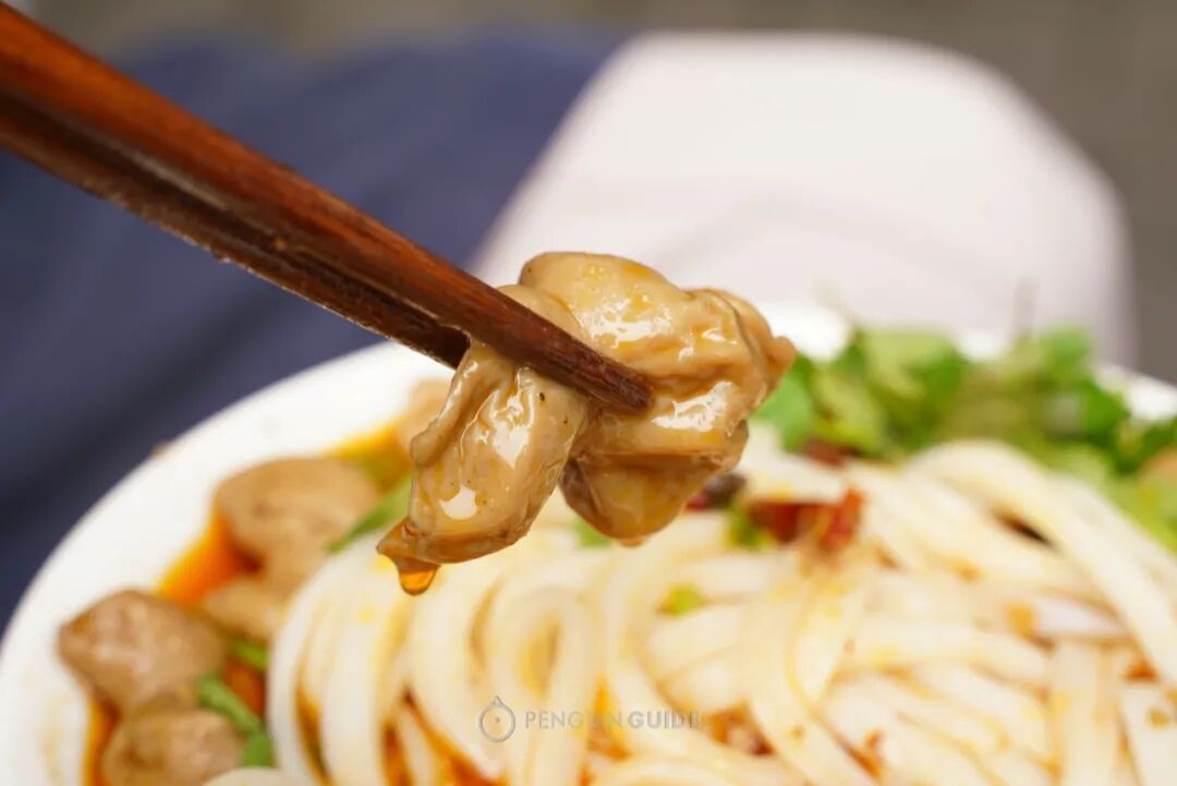 提前用辣油烧制,辣味早已渗透进了每个孔隙中。配上软糯的长寿米粉,浸泡在汤汁里,相当吸油吸辣……