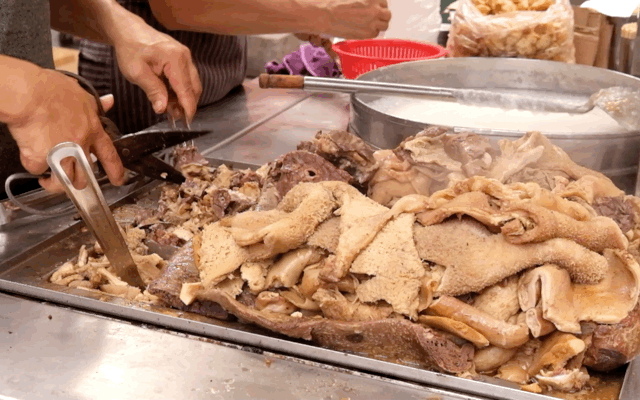 在一座牛杂山面前,只需要选好价位,再交代一下特别偏好的部位,老板便会眼明手快地剪好一碗,麻利地勺上一勺热汤汁淋上。
