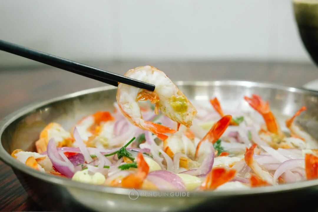艇仔虾,时令的鲜虾全都自带虾膏,不过简单的清蒸,却因为加入了大量的洋葱,变得鲜中带甜。