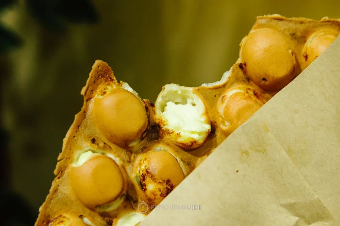 别看外表就像普通鸡蛋仔,其实每一球里都填上饱满的葡挞馅,能吃到浓浓的焦糖味与脆香。