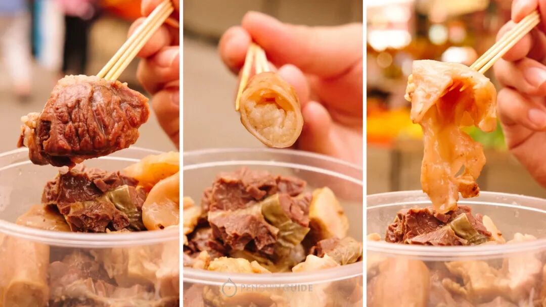 牛杂们在牛汤里熬煮了小半天,口感恰好,即便不蘸酱料也好吃。