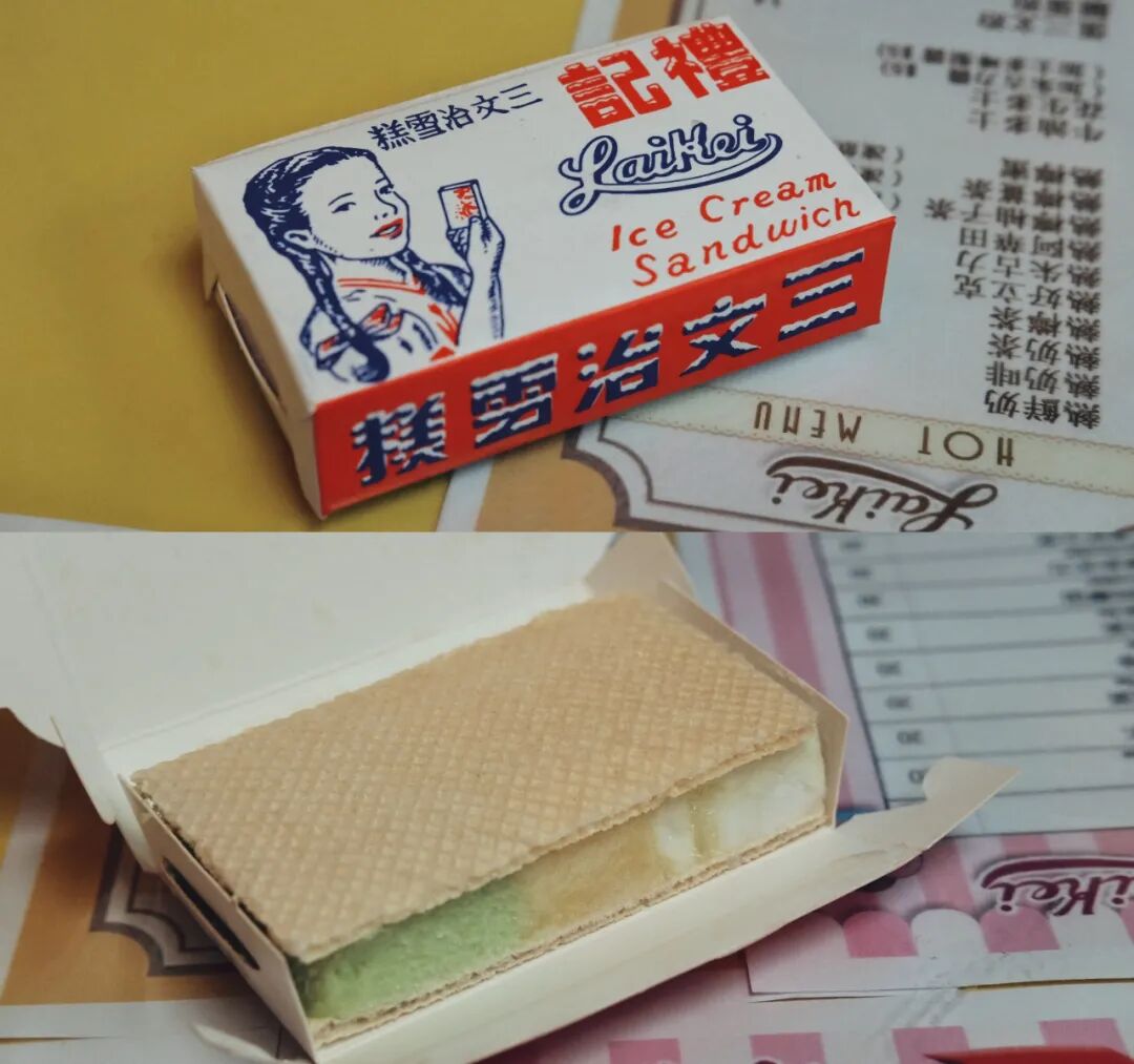 必点的雪糕三文治,用威化饼夹着三色雪糕,味道和包装一样充满古早味。