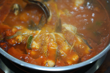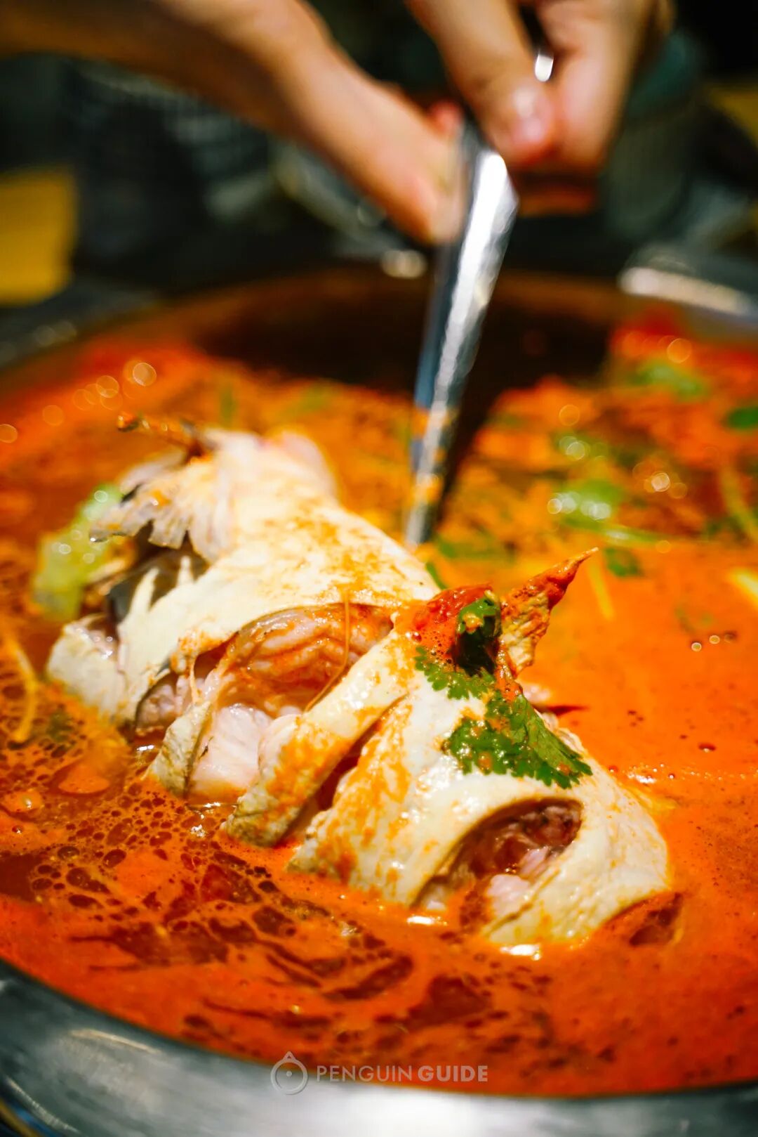 这种用番茄和糟辣发酵的红酸汤,是接受度最高、最普遍的火锅汤底。除了煮鱼之外,还能烫菜烫肉: