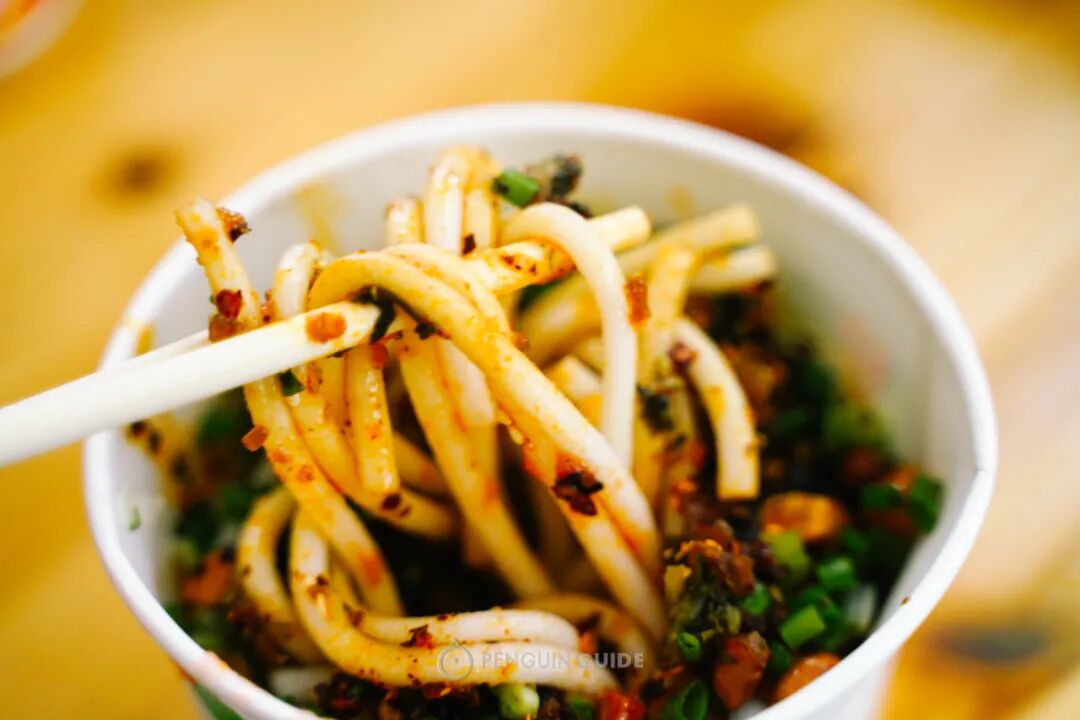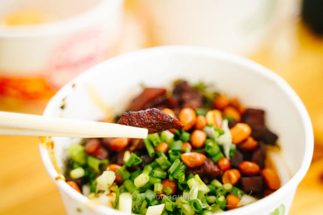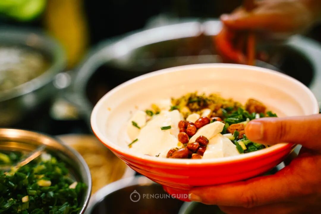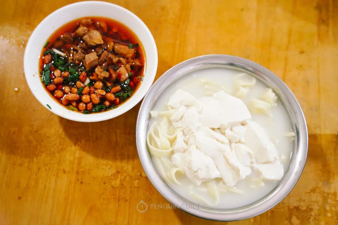 也可以将豆花、面条擓进蘸水碗里拌着吃,当地称为“进桥”。破碎的豆花裹上宽面,蘸水丝丝入扣。