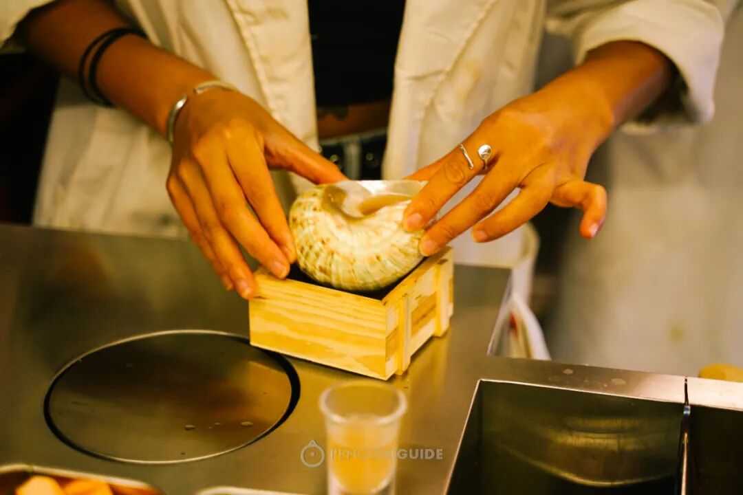 虾与辣椒发酵出的产物,叫虾酸,有接近于虾酱的浓缩海鲜气息。和牛肉、大肠这些本身风味浓厚的食材更契合。