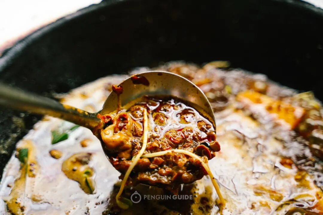 锅底浓稠的红汤,用了贵州特有的“糍粑辣椒”。用花溪辣椒和姜蒜一起舂碎而成,很黏糯。再进宽油,和豆瓣酱一起翻炒,能熬出醇厚的质感。