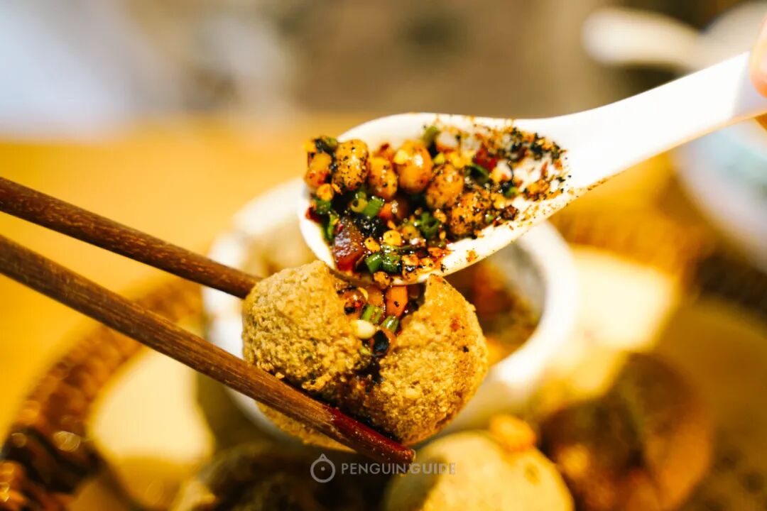 豆腐揉碎成泥,调味后干炸,就成了贵阳最有名的小吃“豆腐圆子”。
