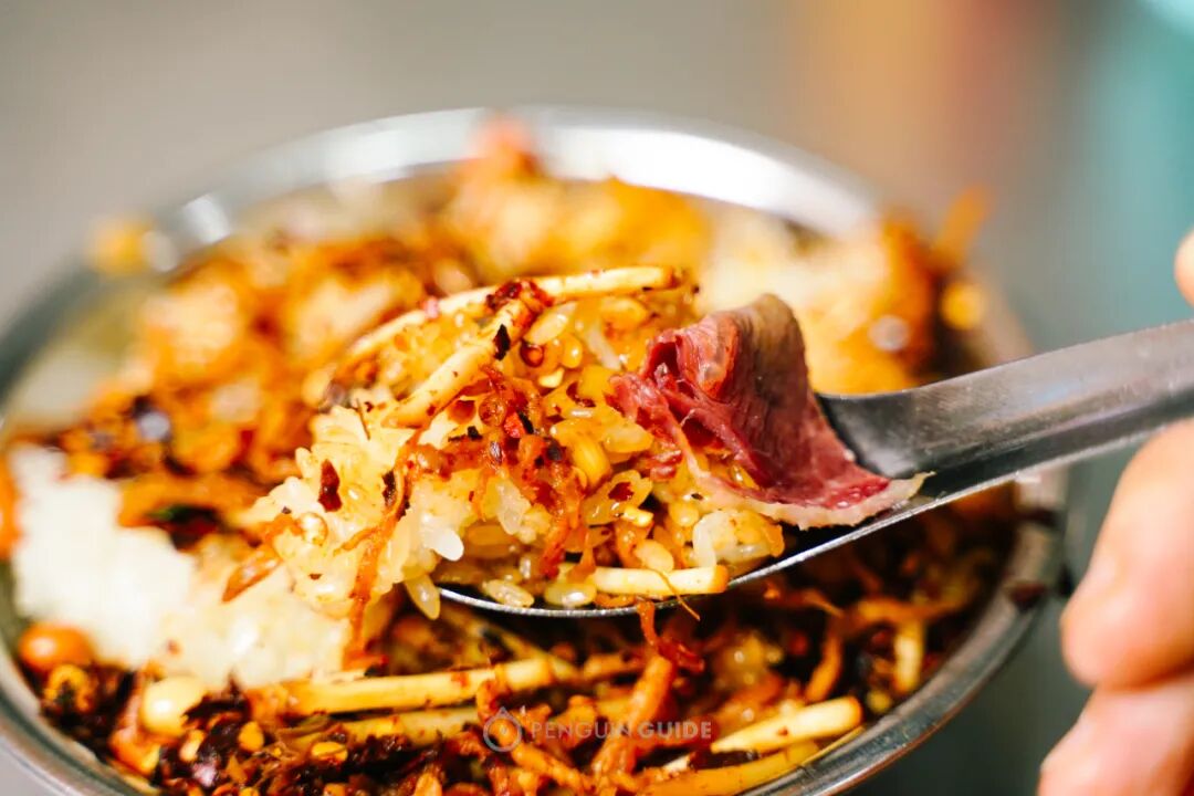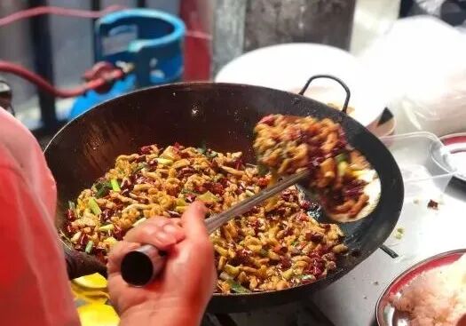 一口老锅,大刀阔斧地翻滚。蒜苗、辣椒和板筋从火苗中粗旷地泼在饭上……