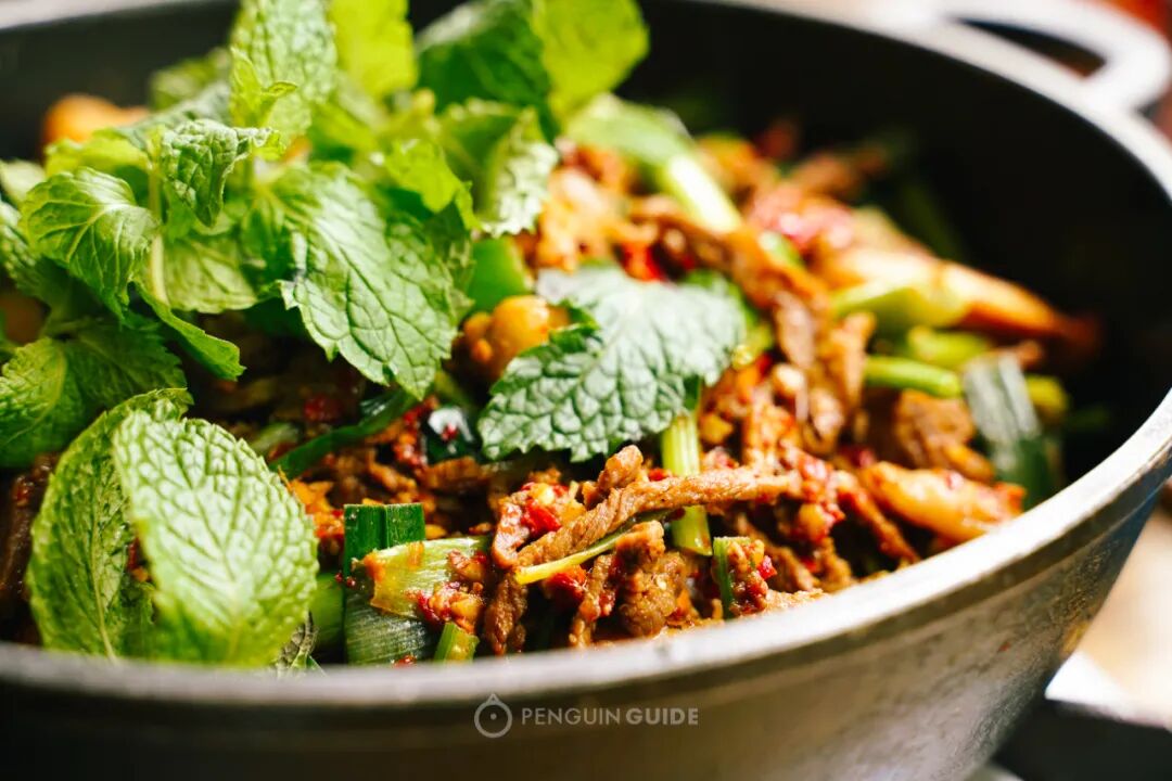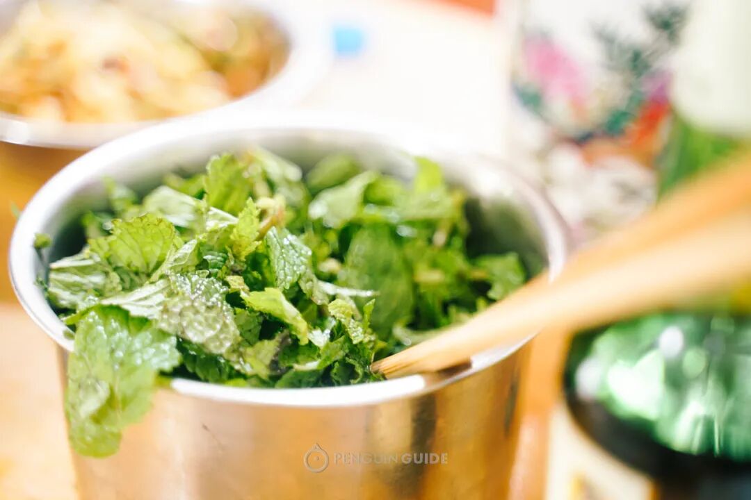 顶上撒一把野薄荷,这也是当地特有的香料,去腥提香很绝。虾酸、大肠这些个性奔放的食材,都被驯服得性情平和起来。