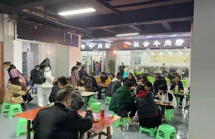 不认识的人拼桌围坐在在一起,局促地缩在矮凳上,专心致志地吸溜着米粉。