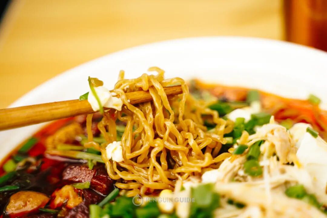 肠旺面汤底红辣香浓,专门用纯海鸭蛋和的竹升面来搭,挂汁一流。大肠处理得盘靓条顺,血旺啵啵嫩。
