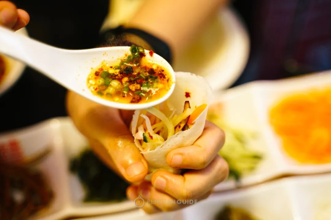 清淡素净的小春卷,不许任何荤腥(除了脆哨)的加入,全靠最后一勺调好的蘸水浇灌其中,立马活色生香起来。