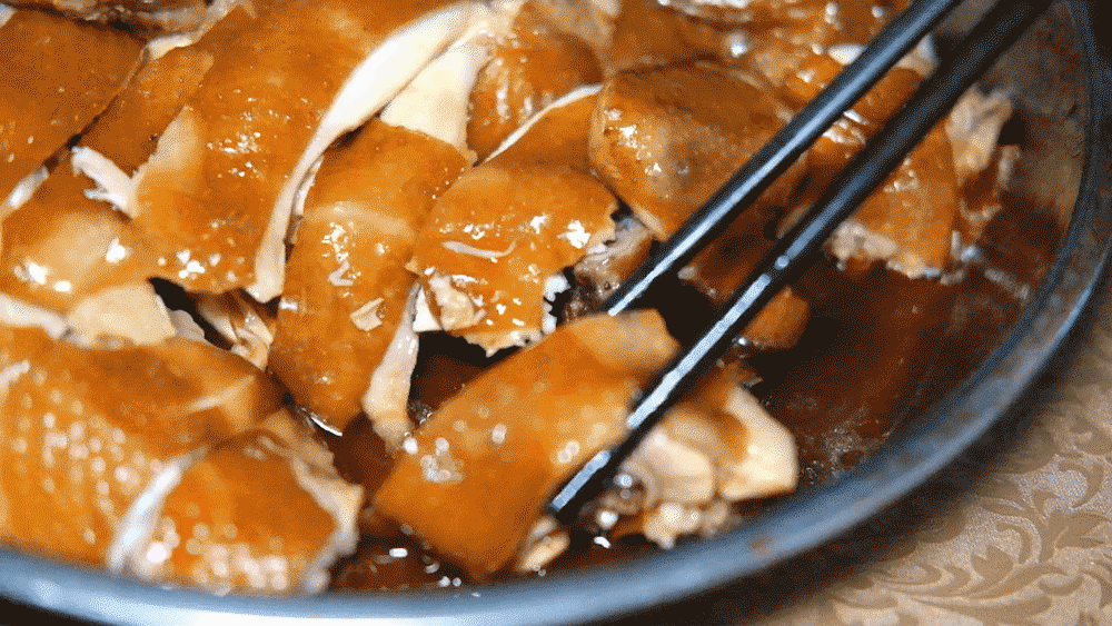 例如这道豉油鸡,以传统手法一遍一遍往鸡身热浇豉油至全熟,选的鸡种偏瘦,鸡皮薄而嫩滑,能更快速地渗透豉油香气。