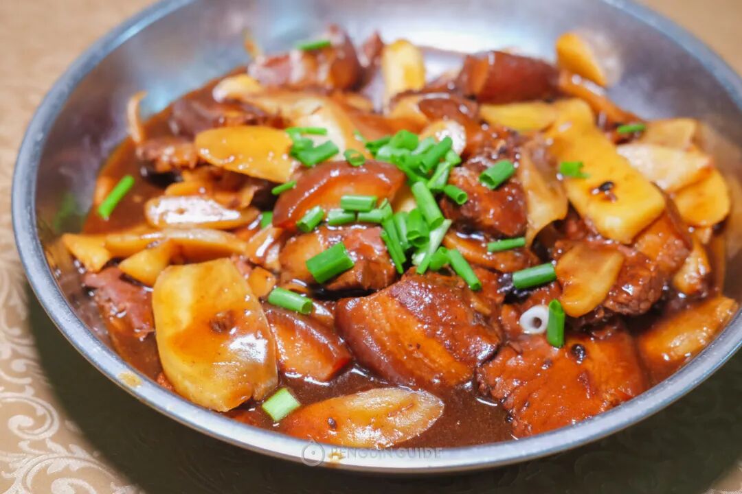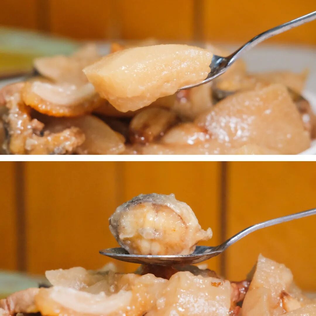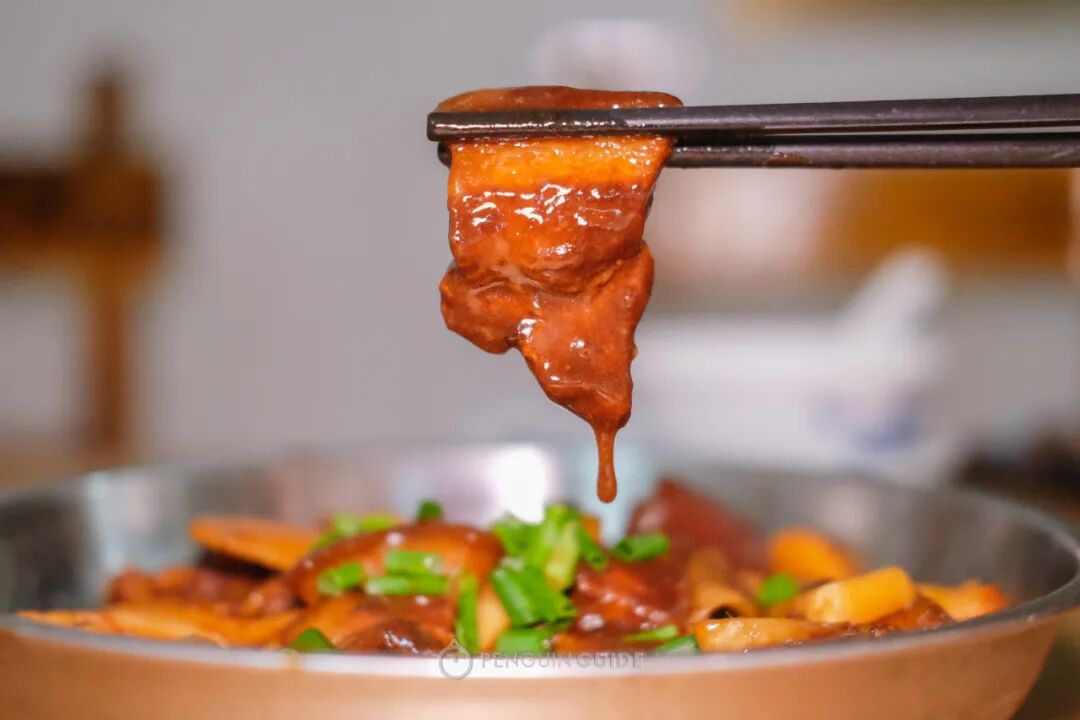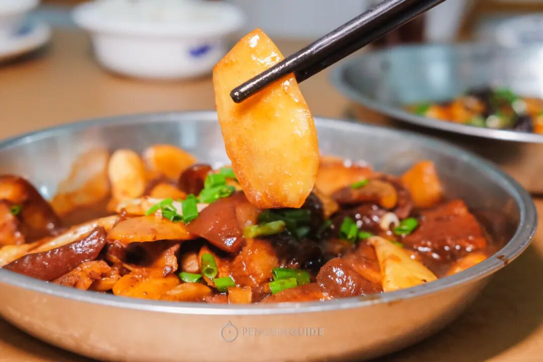 搭配也很有意思,是以自家腌制的萝卜干共焖,煮出一锅略带酸香的鹅肉,浓重汤汁中带着清晰的酸调,毫不腻味。而在炆煮的过程中,萝卜干也吸收得绵软多汁,质地相当有趣。