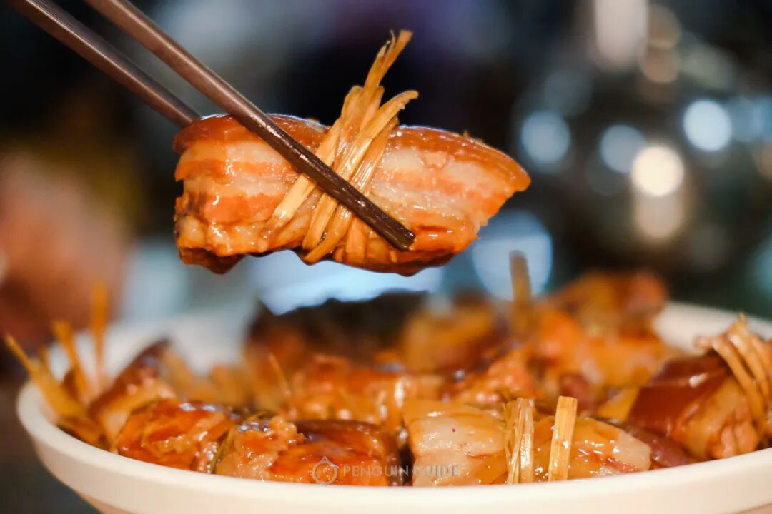 稻草扎肉就很精彩。选的是肥肉较厚的五花腩,均匀切分后,每一块都以当地的禾杆草扎着焖煮,既保持外形,也能吸油增香。