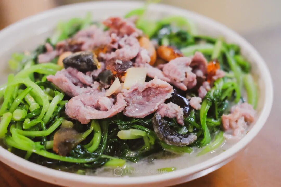 广东人吃饭必不可少青菜,这里能吃到当地种的芥蓝苗,清甜爽脆。以上汤浸吃个原味,店家自己会加上大量瘦肉皮蛋来吊味,收的依然是青菜价,怎么这么实惠又良心啊啊啊。
