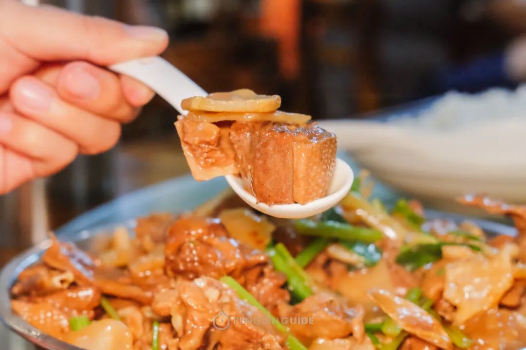 这道面豉酸姜蒸花肉,厚薄均匀的花肉被蒸煮得绵软,吃时记得在面豉酱里大力滚动,让肉身完全浸润酱汁,连下三碗饭是走不掉了。