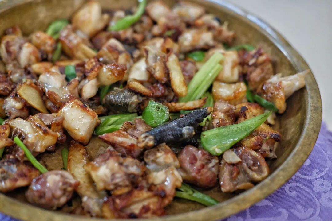 店名叫“林记私房菜”,开在村里的普通居民楼中,钟村特色食材与鸡馔都是招牌,例如这道干逼鸡也很不错,需要提前订位。