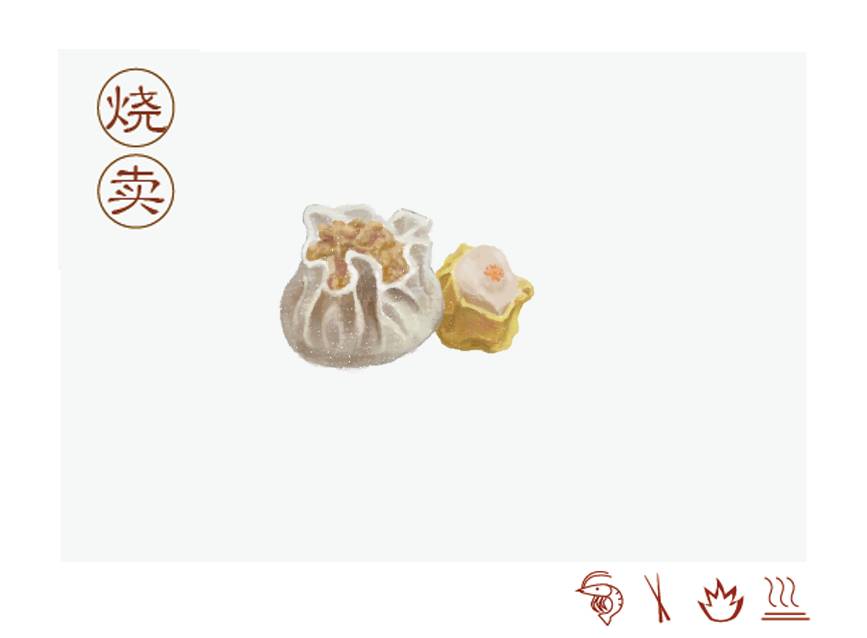 说到烧卖,又得牵扯进南北之争:包的到底是糯米还是肉!?茶楼里的干蒸烧卖,面皮与北方的烫面儿皮不同,由于加了鸭蛋而呈黄色,张口下掐一个“小腰”;馅料半露为猪肉、牛肉或者虾肉,为了增加层次也会加入笋粒和香菇(干物为佳)等,再点缀上一小撮蟹籽。