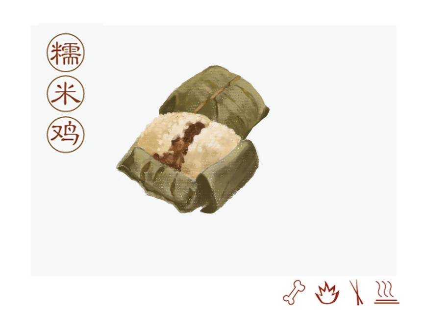 糯米里面包进了鸡肉,配着冬菇、叉烧、咸蛋黄等,再用荷叶裹严实成四方形状,入蒸具蒸熟。荷叶清香和鸡肉油香渗入了糯米,两相平衡,但吃一只就饱了!