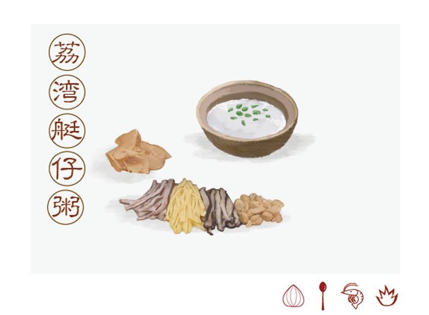 用料繁多,既讲究(配料可达十几种)又随意(添加之物往往也可信手拈来)。相传是荔枝湾河流之上的艇仔之上制作而成(想起了泰国的船面),白粥里加了小虾米、鱼片、海蜇、鱿鱼、瘦肉等增鲜,吃前一刻又加入炸花生、油条等香脆之物,每一勺都可以舀到惊喜,混合的口感正中下怀。