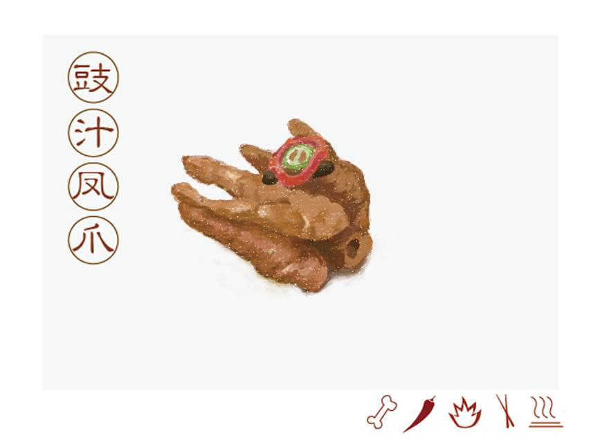 鸡爪先入油炸,再放入豆豉酱料中蒸酥,色泽诱人,皮酥肉软,胶质浓稠,骨肉几乎要分离。也有变化用上了蚝油、OK汁等。豉汁是最传统的酱料,茶点乃至粤菜中使用豉汁的菜式极多,还有豉汁排骨、豆豉鲮鱼。豆豉、蒜蓉衬托肉类的甜鲜,如果加了芋头粒香气更增一分。