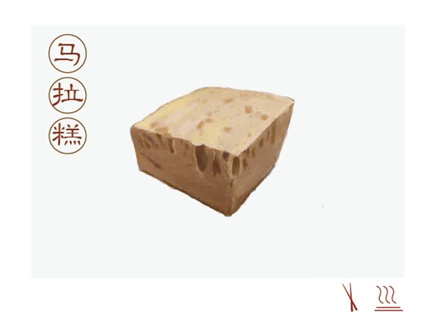马来的舶来品,变音为“马来糕”:外皮细密带麒麟纹,内部像海绵一样蓬松多孔,切面纹理上层疏松垂直下层沉浆细密。揭开蒸笼盖子就是鸡蛋和黄油的甜香。