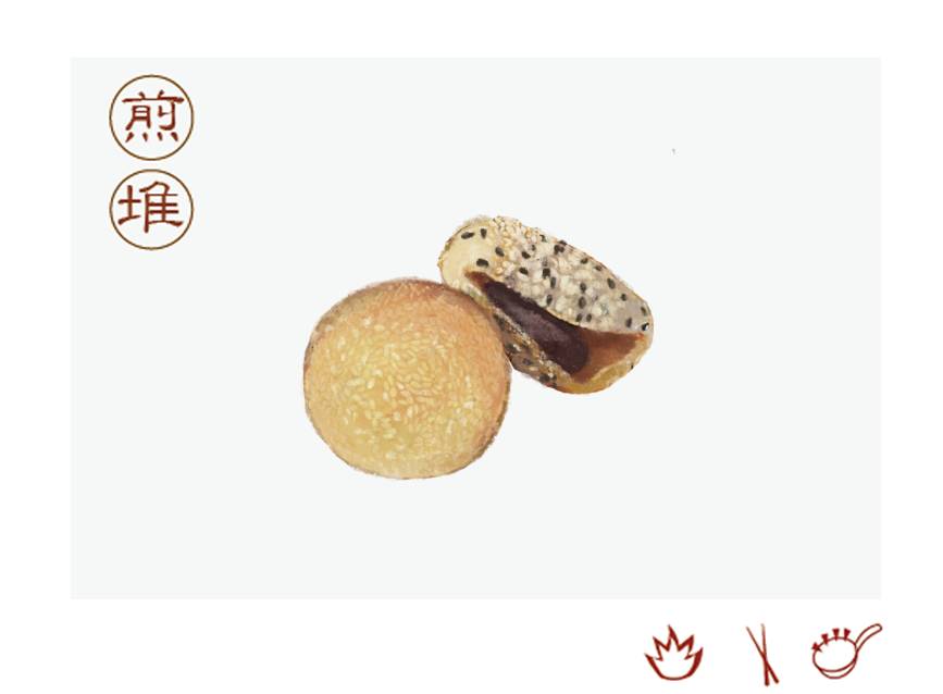 裹满了芝麻、炸得金黄的糯米团:北方叫“麻圆”、广西称“油堆”、海南名“珍袋”。酥脆外壳,绵柔内里,甜馅为主:花生糖、芝麻、豆沙等,也有咬一口到空气的空心球。