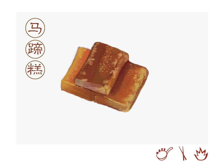 广州西郊盛产荸荠(马蹄)。马蹄粉和马蹄肉粒拌入糖水蒸制,口感清甜带着爽脆。马蹄有祛湿清热功效。做法异曲同工的还有伦敦糕、芋头糕、绿豆糕、椰汁糕、萝卜糕等。
