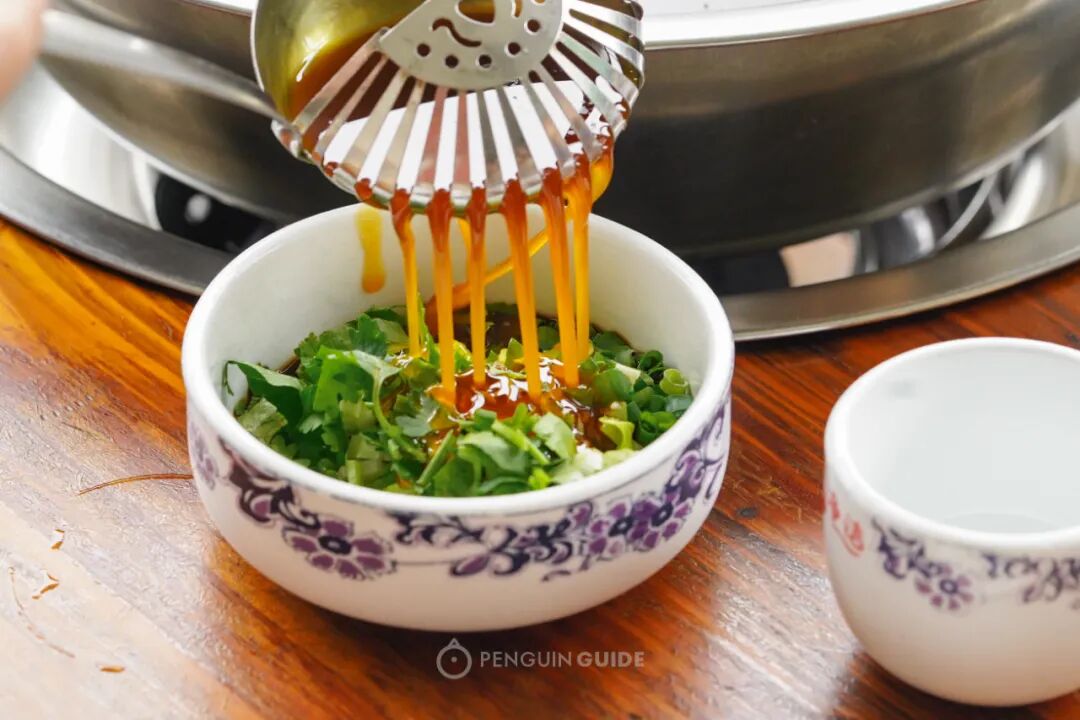 这是火锅兔,区别于其他火锅最独特的仪式感:小葱小料经过热油汤的洗礼,才能释放出深处的灵魂,去亲吻浸入碗中的兔肉。