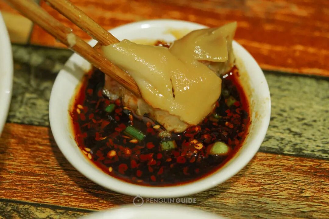 一坨肉馅里镶嵌了几小块肥肠,嚼起来“朗朗上口”,弹力十足。肥肠竟是卤过的,不断有卤香释放出来,毫无腥气,还放了点香菜芹菜解腻。
