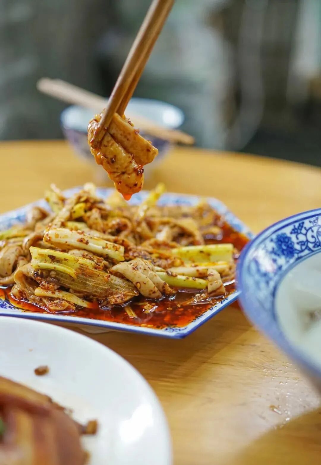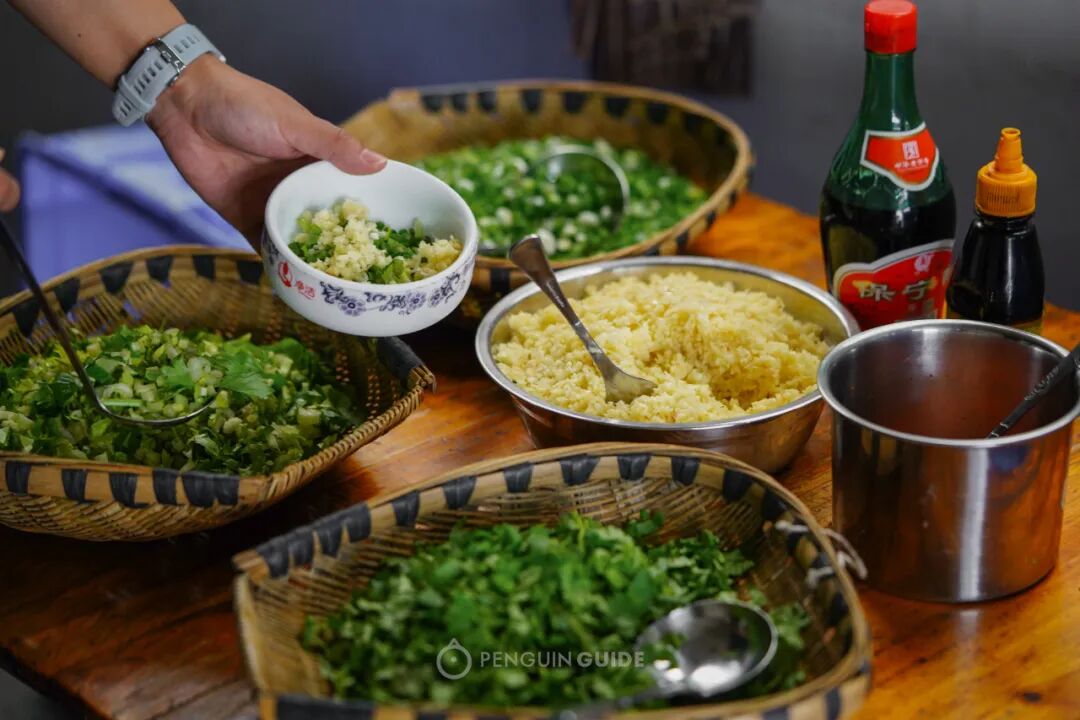 比如最招牌的凉拌就挺有意思:不是惯见的红油麻辣,铺了满满的韭菜,清香尤其温柔,微微酸辣,很是清新。