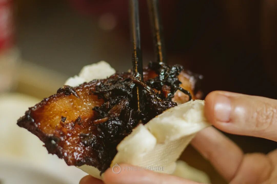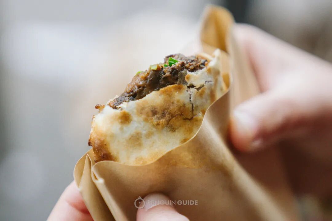 和三肥七瘦的肉馅一起搅上筋,裹进烤饼里。虽然烤饼哪里都有,但好吃的霉干菜,真的能增色太多。