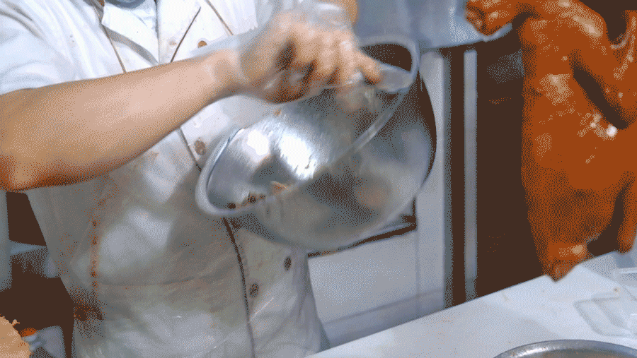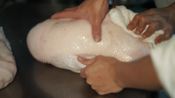 腌制结束后,还有两位师傅专门负责吹气,给鹅做马杀鸡,从鹅身到鹅腿仔细揉搓……不禁感慨人不如鹅