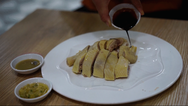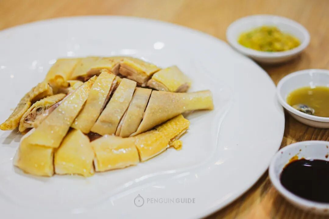 吃法也派头十足:一鸡上桌,三酱环绕,轮流蘸着吃,入口先是豉油的微甜,再感受到强烈的海味咸鲜,层次感非常丰富。