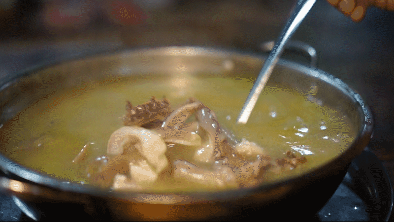 比起白切鸡用药材香料调和成的白卤水,市师鸡全靠这一锅鸡高汤:鸡和水的比例接近1:1,慢火熬煮6-7个小时,只用淡盐调味,称得上原汤化原食。