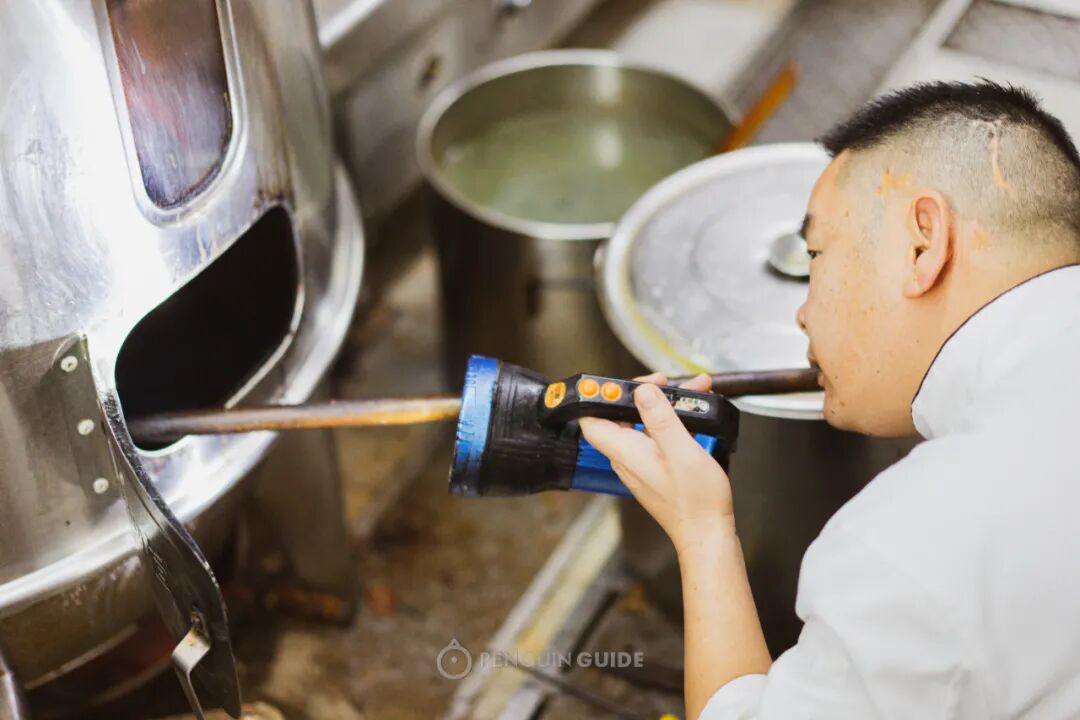 这位举着电筒的张师傅,已经从业超过三十年,仅是在这里做烧鹅也有二十年的时间。什么时候该加炭减炭,调整鹅身,他用电筒照一照就知晓。