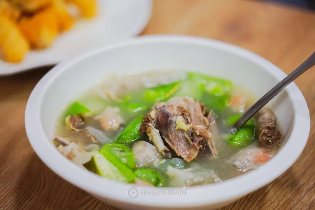 斩鸡切下的大骨,吸饱了高汤的鲜香,店家也不会浪费,刚好可以拿来滚一道胜瓜鱼包鸡骨汤。