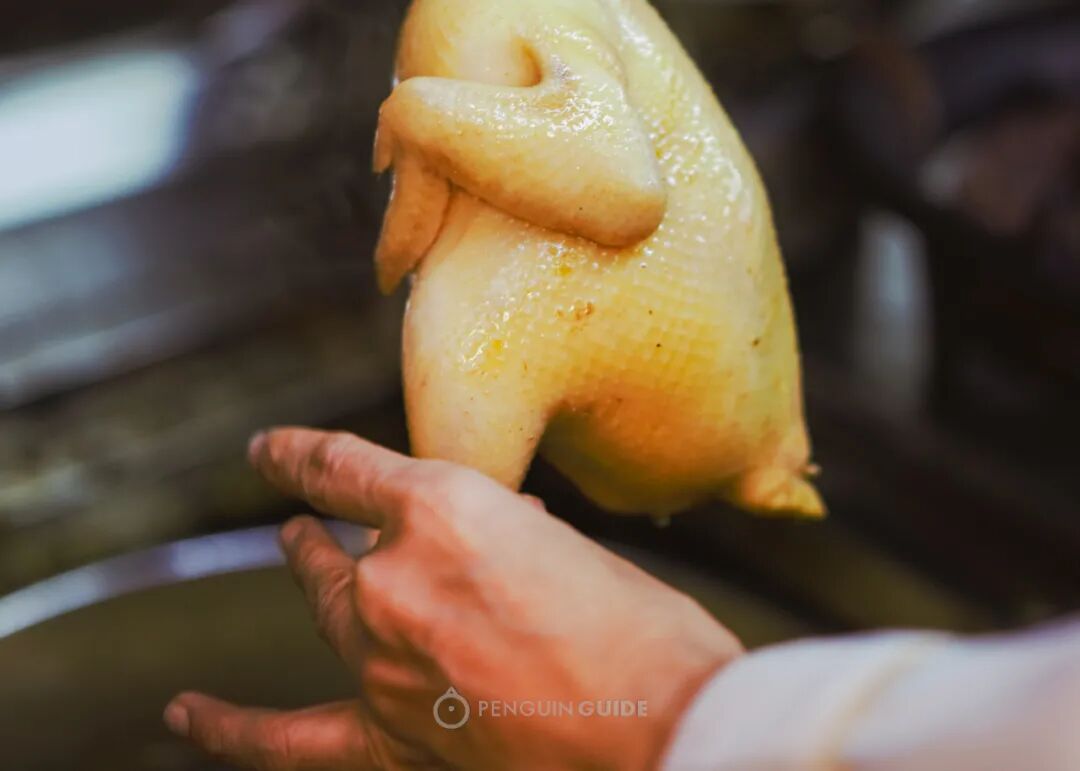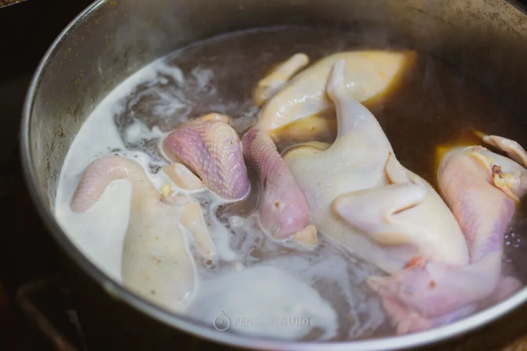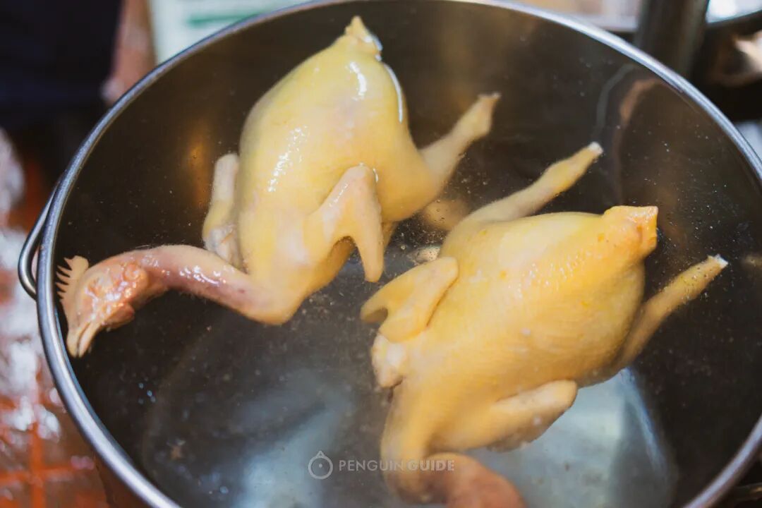 接下来,再把整鸡放入熬好的高汤中浸熟。浸煮时间很微妙,过短会入味不足,过长则煮软偏烂。