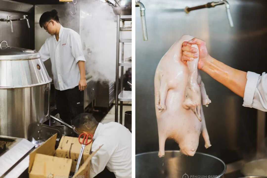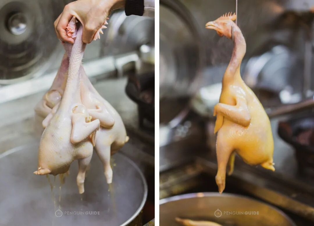 接下来过冷河,让鸡皮更脆爽,再离水吊干,让皮肉口感更加紧致。