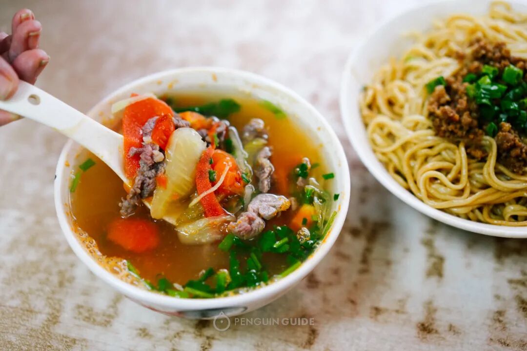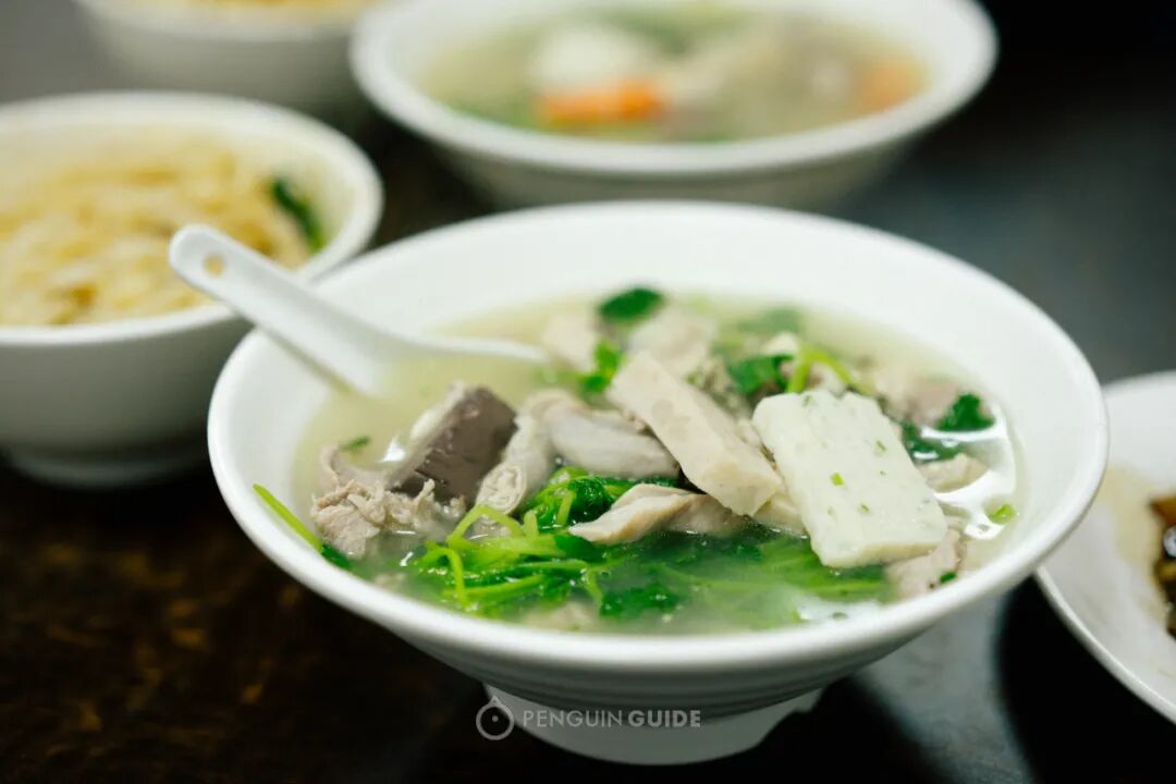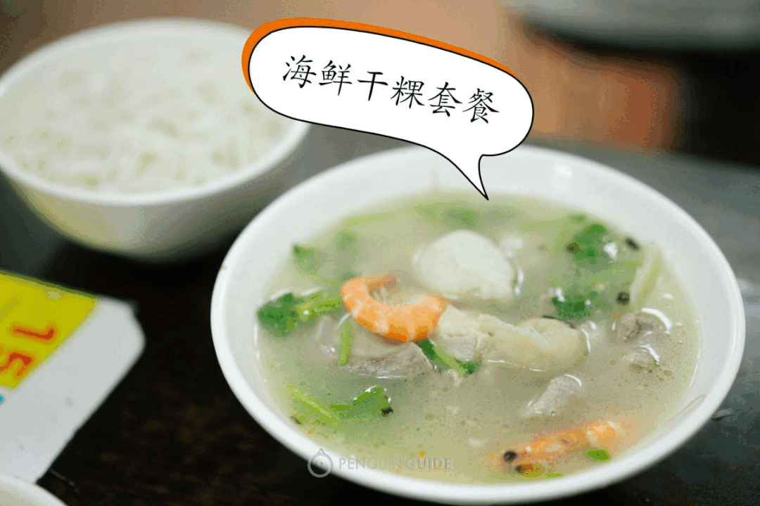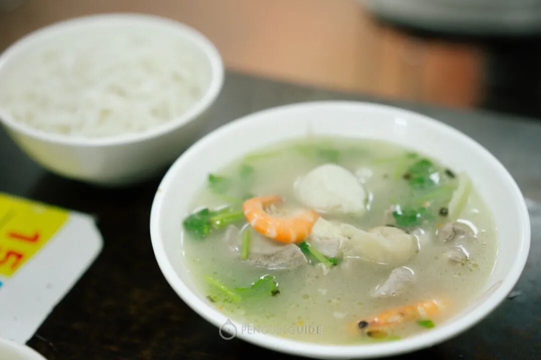 海鲜汤的搭配则有鱼虾小贝、肉丸等,胜在新鲜,与骨汤一煮,香气加倍。吃得相当舒服。