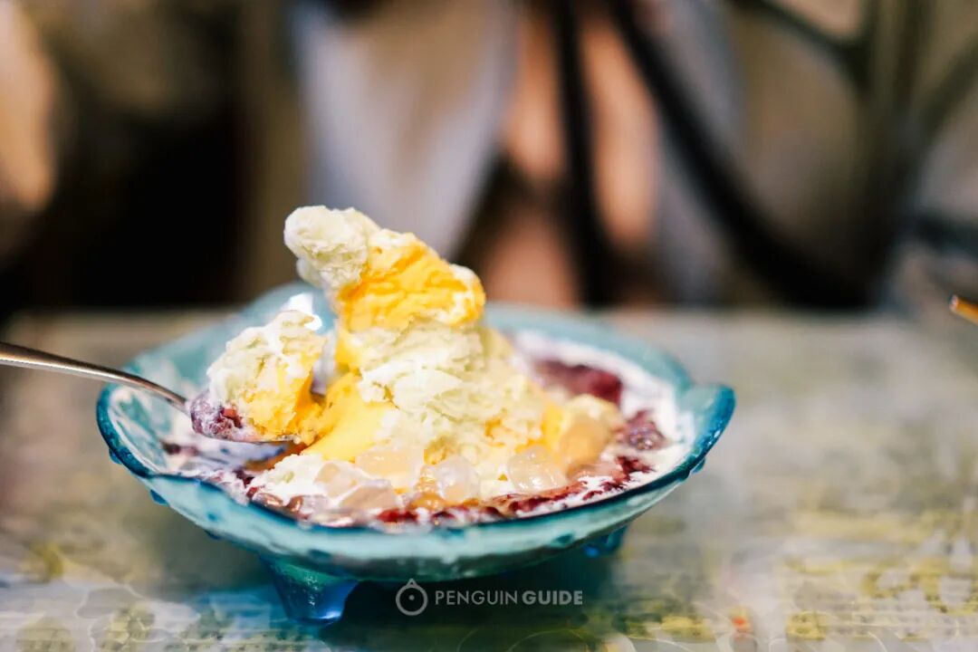 还有一道番石榴芒果黑糯米芦荟雪花冰,黑糯米做得特别爽弹,与雪花冰融合,柔柔水水的,很美妙的体验。