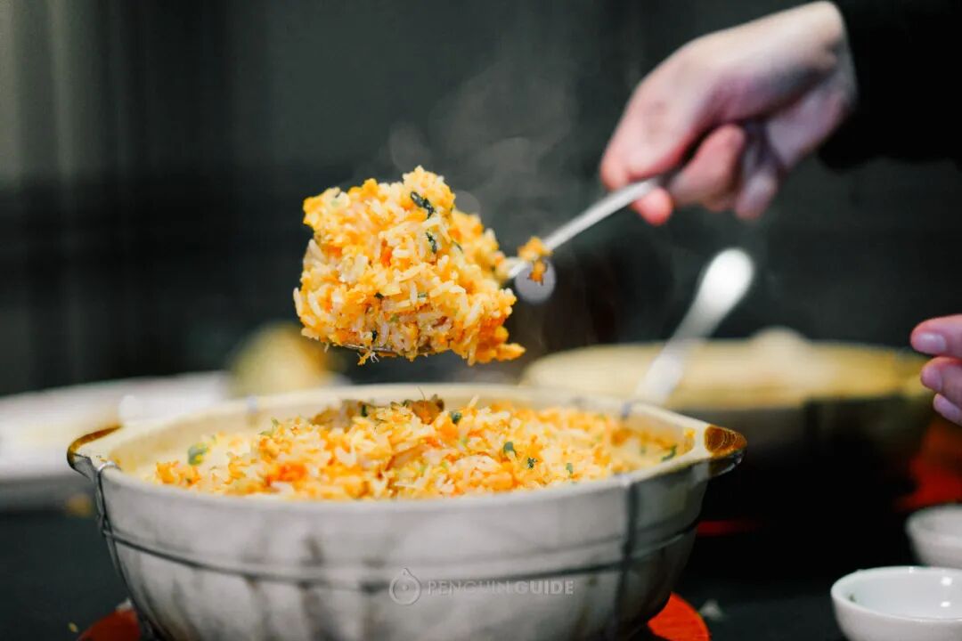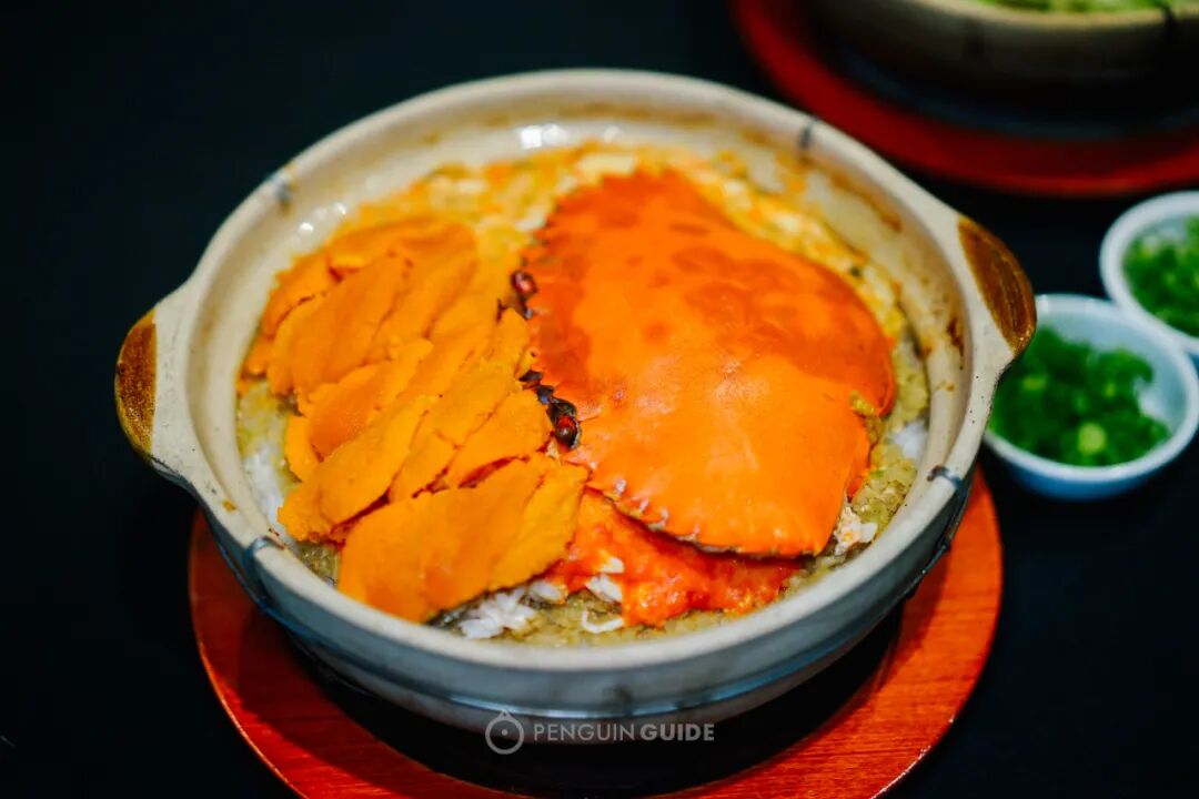 服务员训练有素,会仔细有力地把饭捣拌均匀,还特意挖出饭焦,确保每人都分到一块。每一口饭,都交织着蟹肉的甜、海胆的鲜,锅巴的焦香。