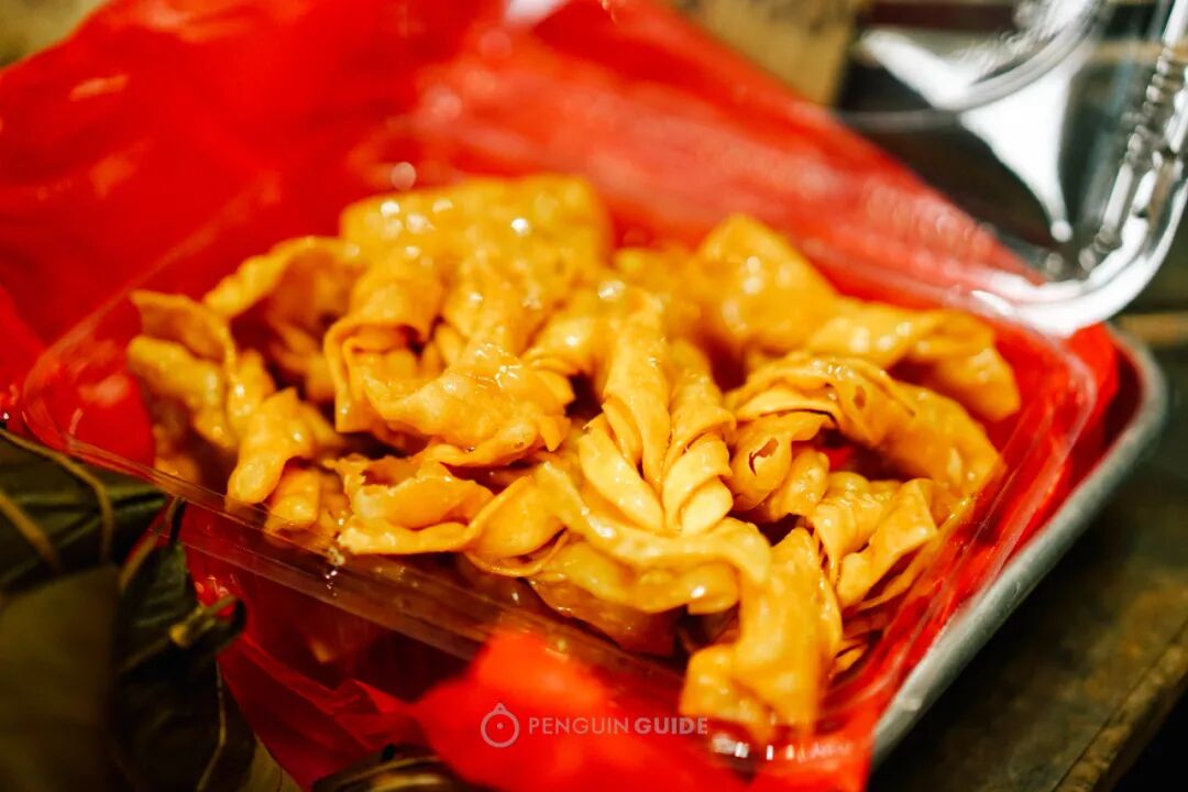 例如手工做的广式腊味,有少见的瘦肉条和腊鸭肠,还有堑口包店的糖蛋散,纯心饼屋的花生酥和葱香沙其玛……一圈逛下来,很难忍得住手。