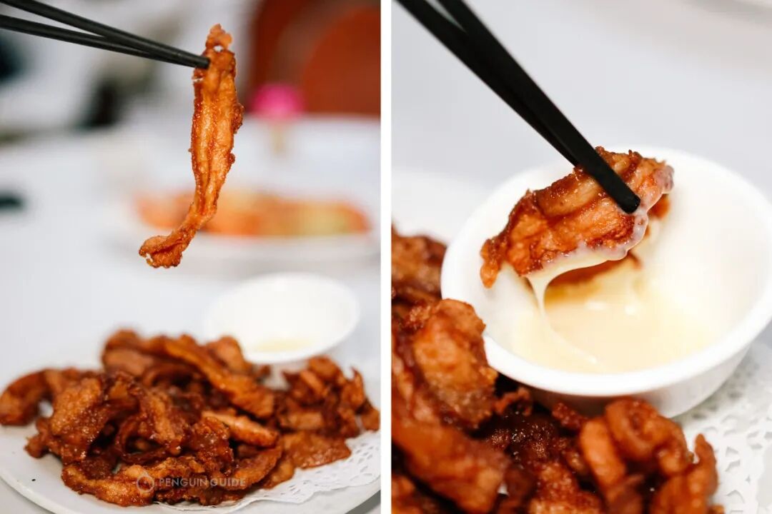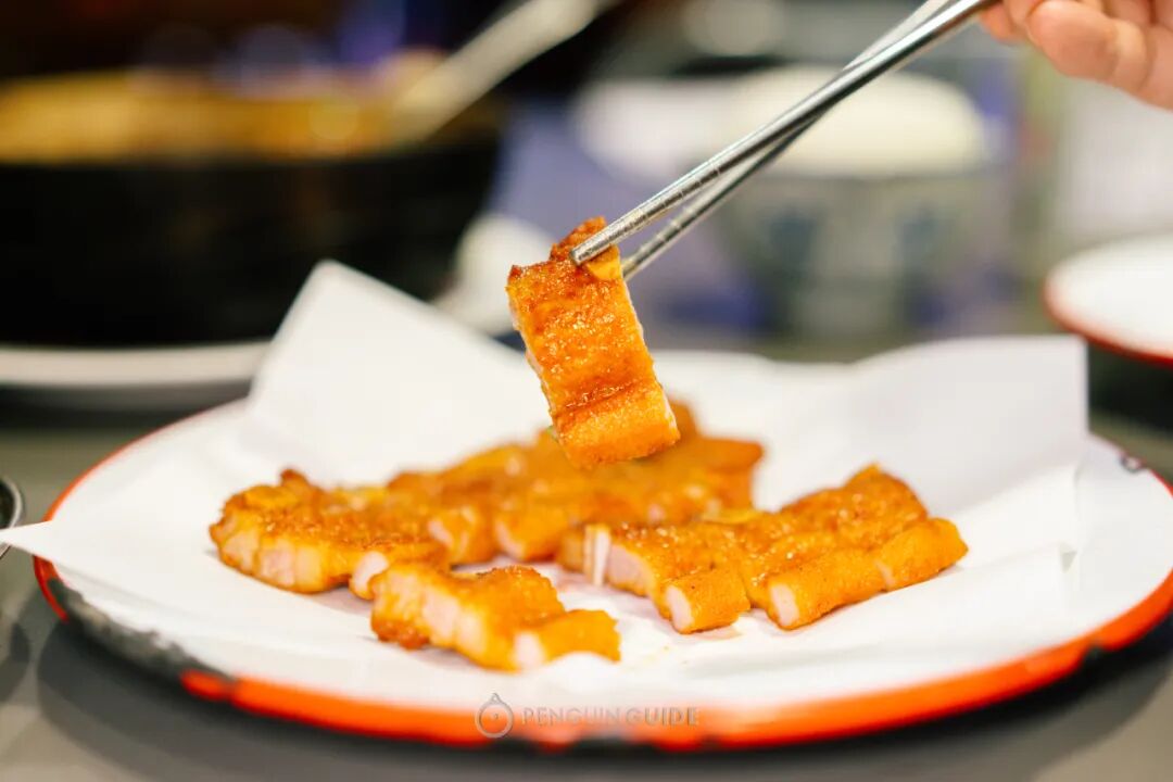 还推荐一道特别的南乳肉,花肉被炸得脆香,蘸炼奶吃,咸甜交织,是老广的特色下酒菜。